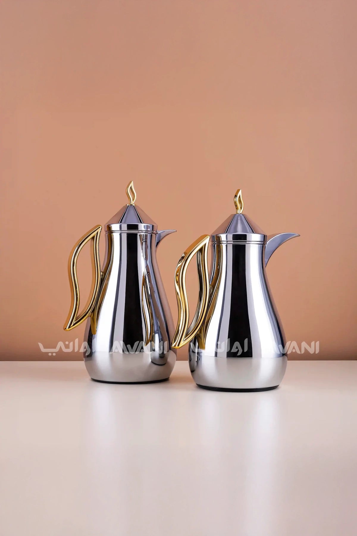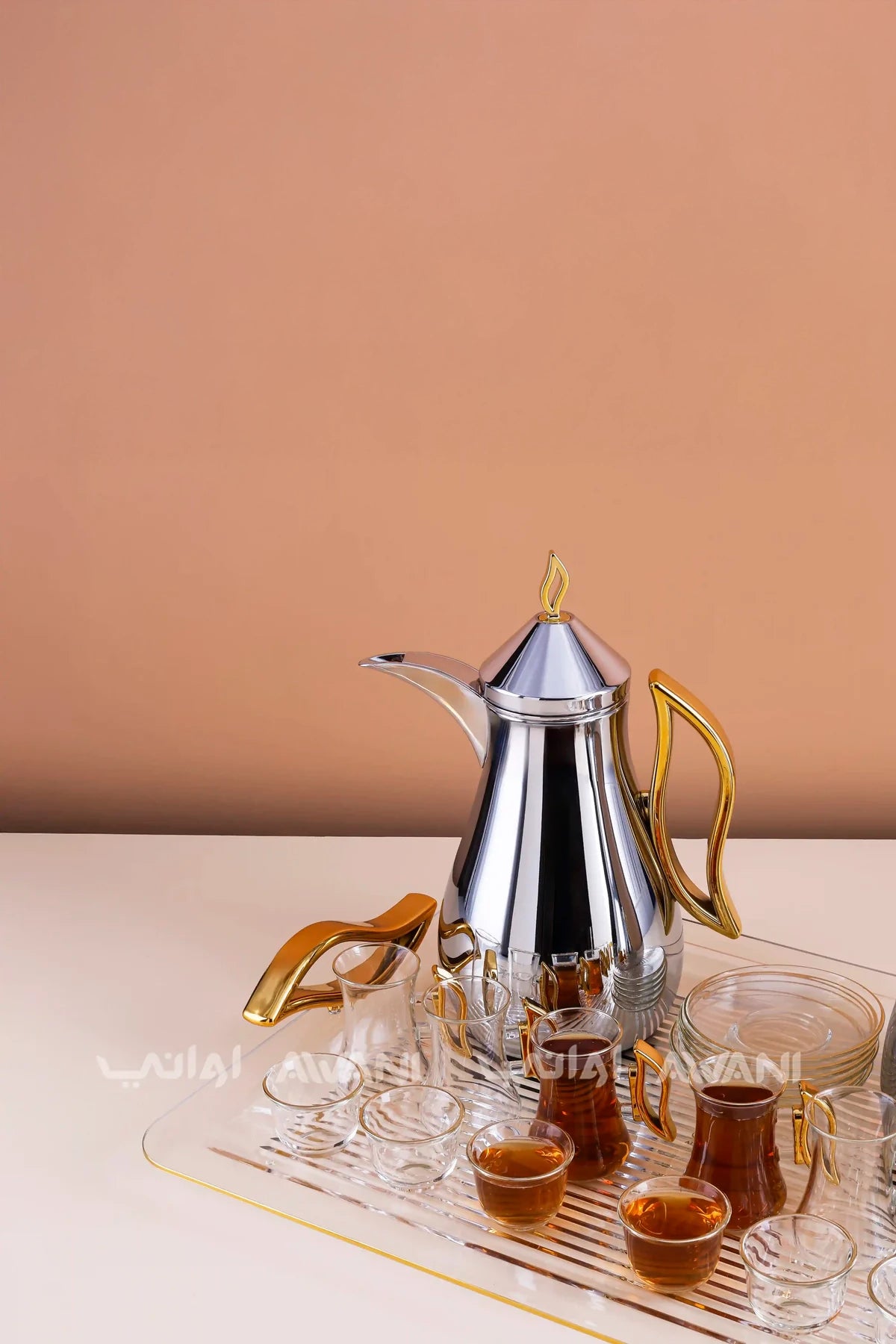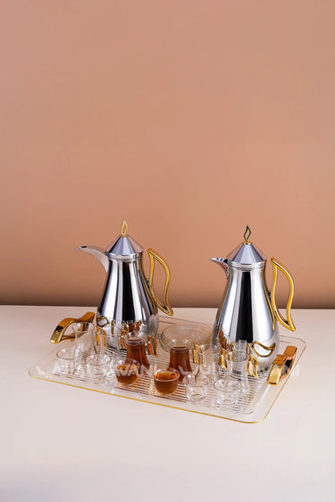 Serve your guests in style with this elegant silver tea & coffee set. Designed with a modern Arabic touch, this set includes 2 premium thermal flasks, 6 Glass Cups, 6Cawa Cups, 6 glass saucers, and a durable serving tray. Perfect for family gatherings, special occasions, or daily use, it combines functionality with timeless elegance.