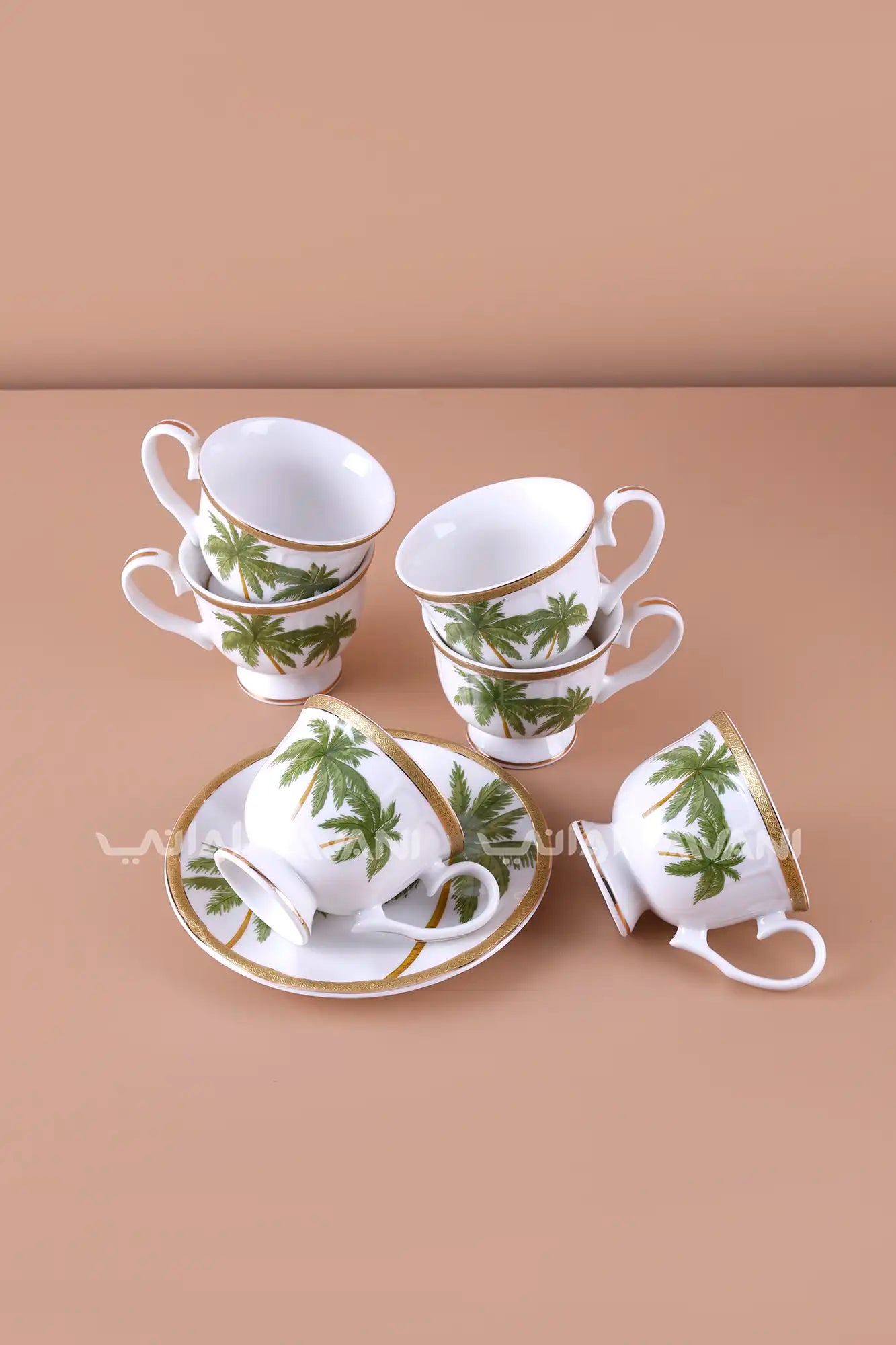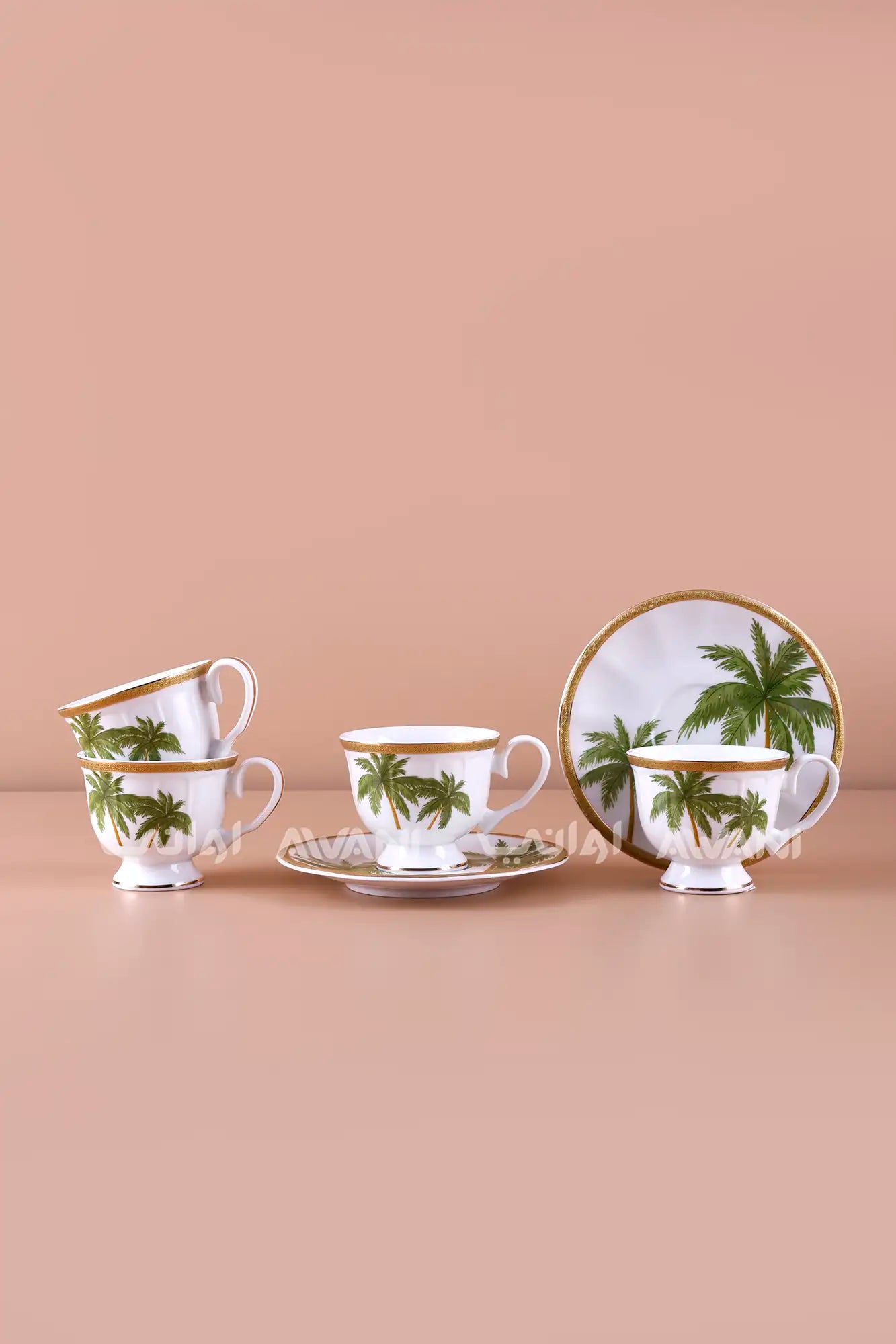 Palm Tree Porcelain Tea Cup & Saucer Set – 12-Piece Set with Gold Accents