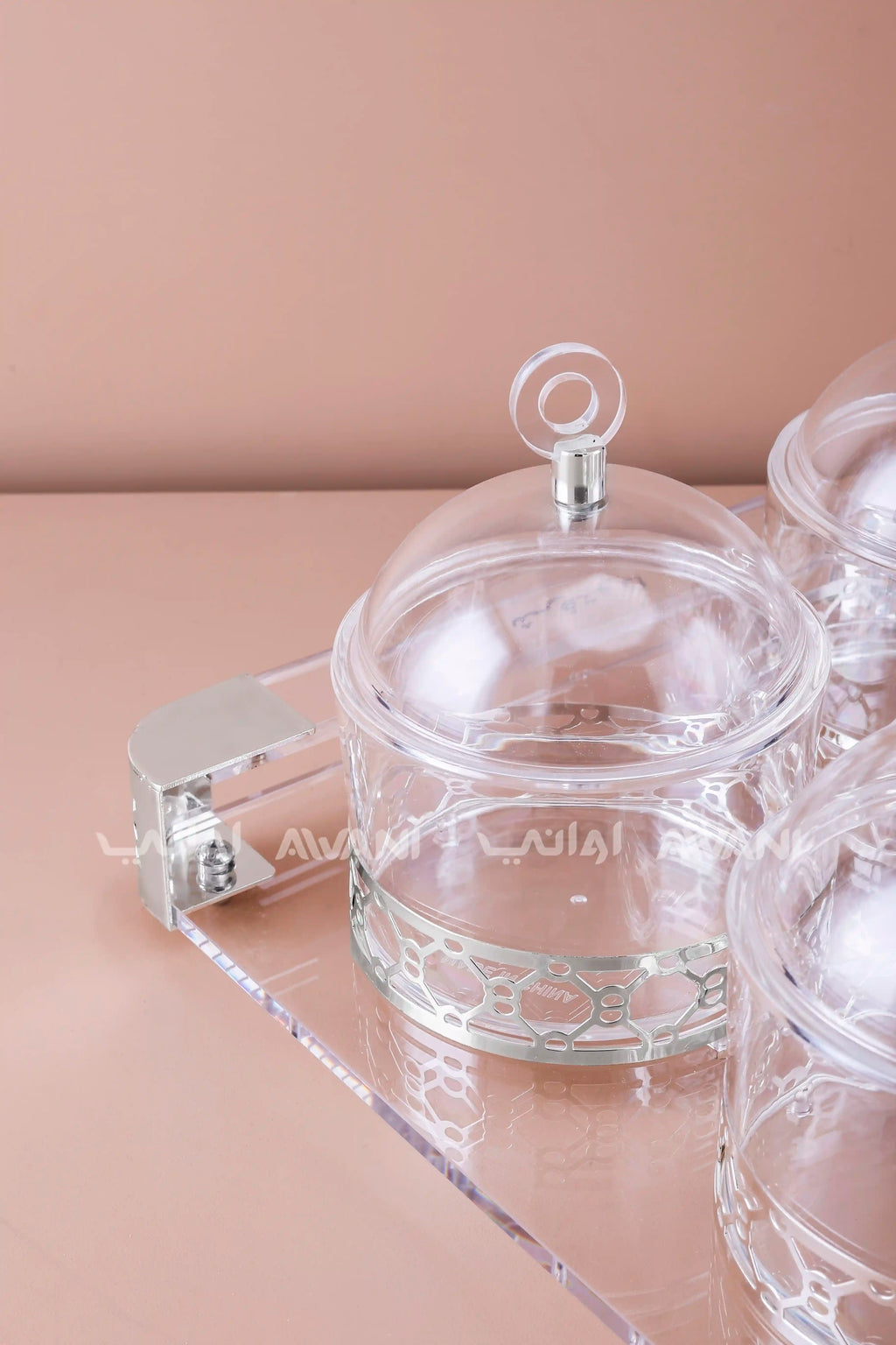 Description: This practical and elegant 4-piece serving set is perfect for any occasion. It features four clear, lidded containers, each with a decorative silver base, securely placed on a matching clear acrylic tray. Designed for convenience and visual appeal, it’s an excellent choice for serving snacks, candies, condiments, or small appetizers to your guests.