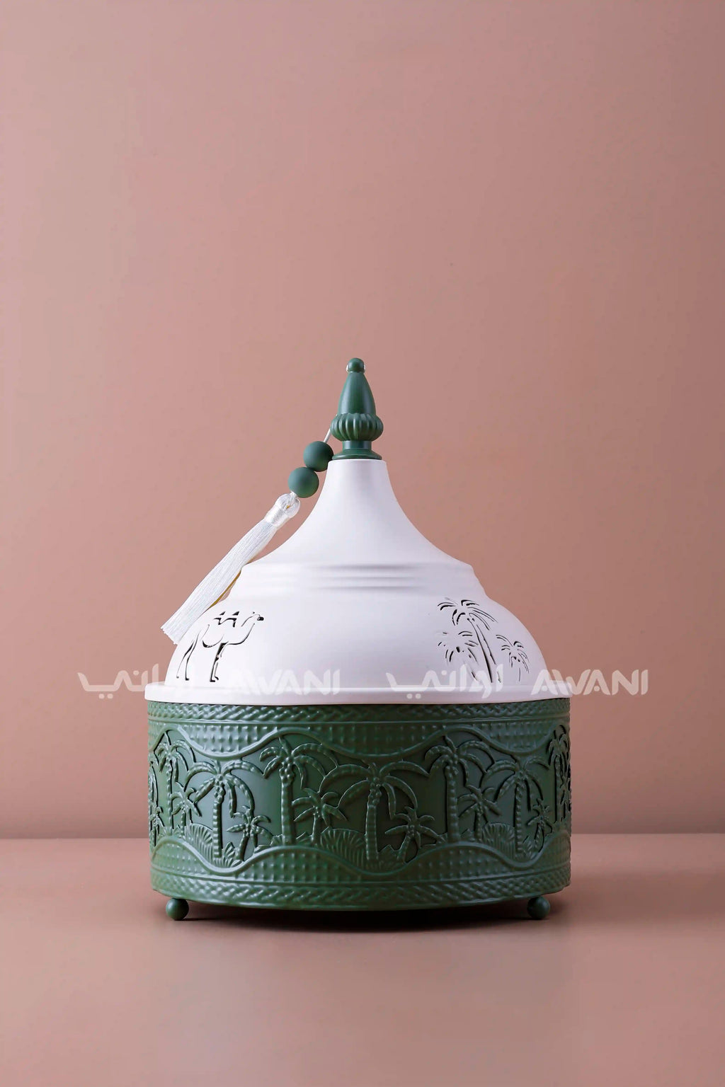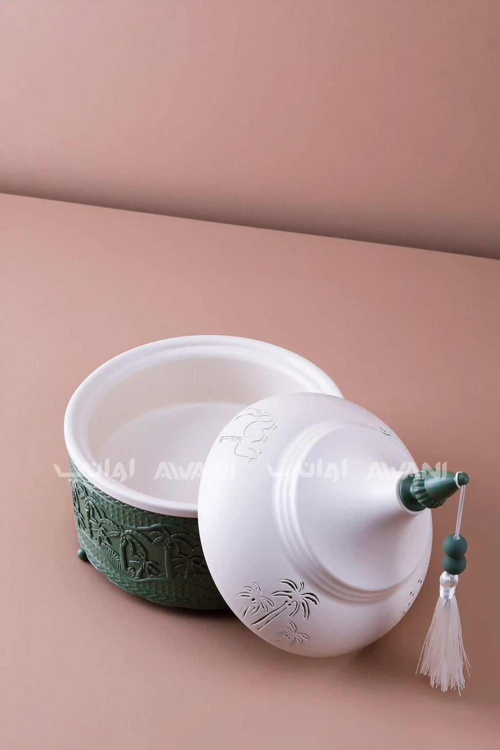 This elegant dessert cloche features a textured, off-white ceramic dome top with an organic embossed pattern, accented by a charming tassel and green bead finial. It rests on a smooth, matte sage green base, perfect for stylishly presenting and keeping treats fresh.