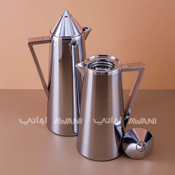Elevate your coffee serving experience with this sleek and modern set of two stainless steel coffee servers. Designed with a minimalist aesthetic, these carafes feature a striking conical shape and a sophisticated brushed metallic finish. Each server is accentuated with subtle gold-toned details on the lid and a uniquely angular, ergonomic gold handle, adding a touch of luxury to your table. Perfect for both everyday use and special occasions, these servers combine contemporary design with practical functionality.