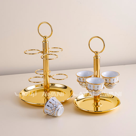 Add elegance to your table with this luxury gold cup and mug holder stand. Designed with 3 sturdy rings, it securely holds cups or mugs, while the round base tray provides extra stability and a stylish look. Made from premium metal with a shiny gold finish, it’s perfect for serving tea, coffee, or showcasing in your kitchen and dining area.