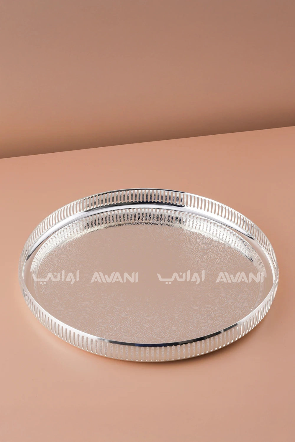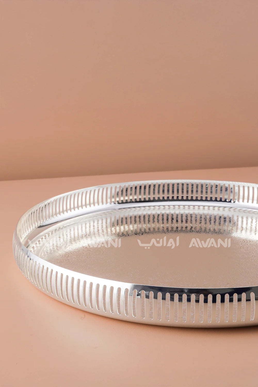 Elevate your serving experience with this sophisticated round silver tray, expertly crafted with a full polished finish that reflects light beautifully. The integrated handle ensures comfortable, secure carrying for both everyday use and formal occasions. Featuring a distinctive line hole design detail, this piece combines functional elegance with refined aesthetics. Perfect for presenting appetizers, desserts, or beverages, the smooth silver surface is easy to clean and maintain. An essential addition to any discerning host's collection, this tray brings timeless sophistication to your table settings.