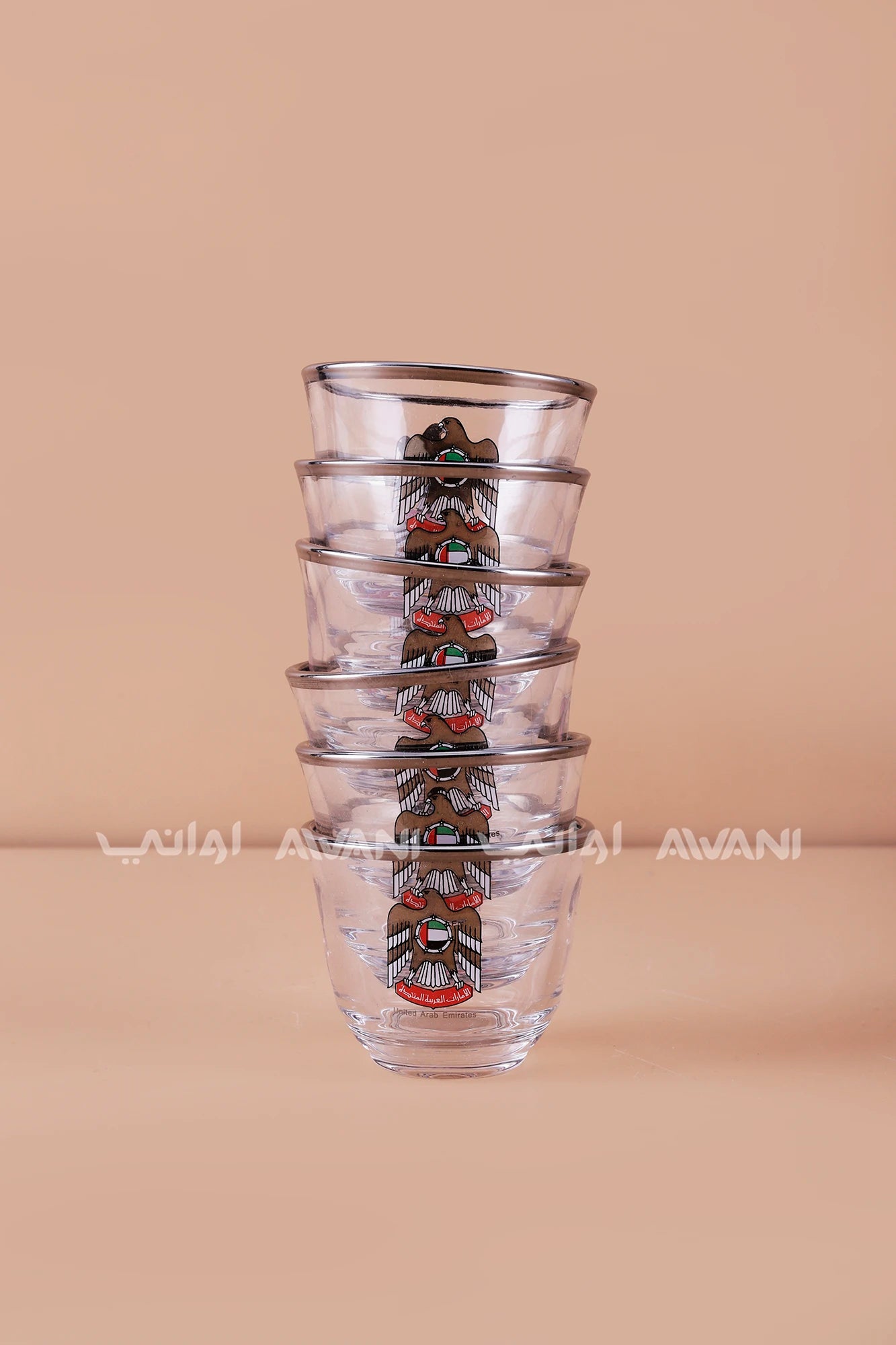 UAE Emblem Glass Cawa Cups – 6 Clear Tea & Coffee Cups with Silver Rim