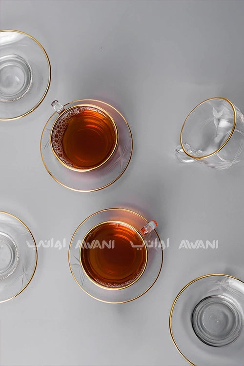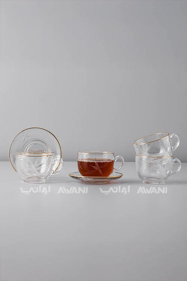 Elegant Clear Tea Glass & Saucer Set – Clear , Gold Trim & Impressed Leaf Design