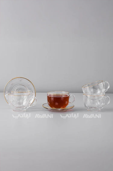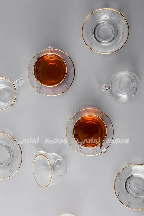 Elevate your tea experience with our Tea Glass & Saucer Set. Enjoy a touch of elegance with its clear milk tea glasses adorned with a star design and gold rim. Perfect for serving your favorite tea in style. Sip and savor the benefits of a luxurious tea time.