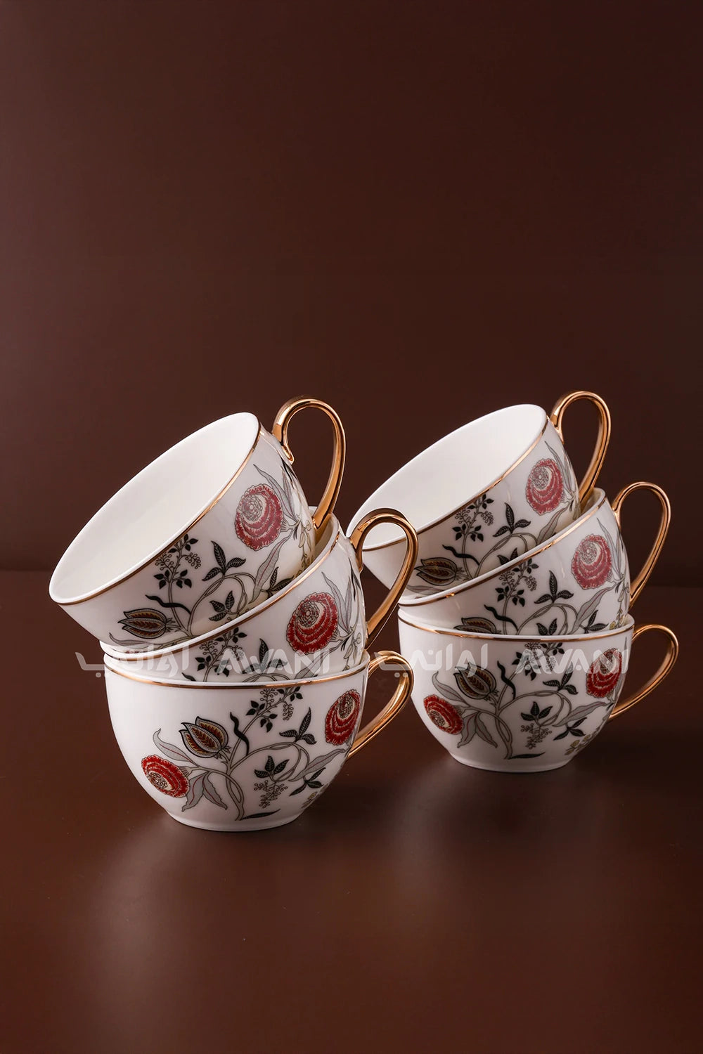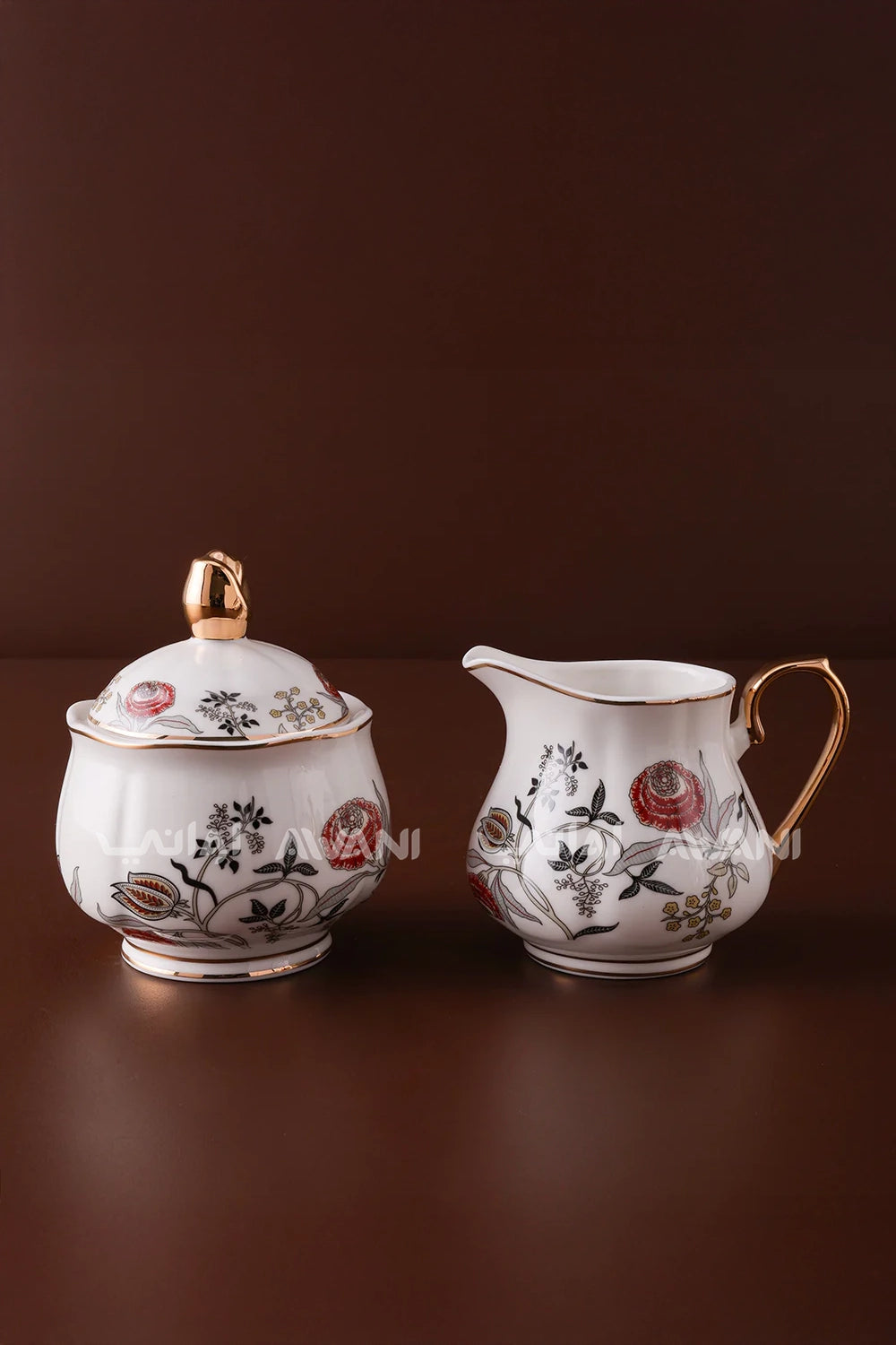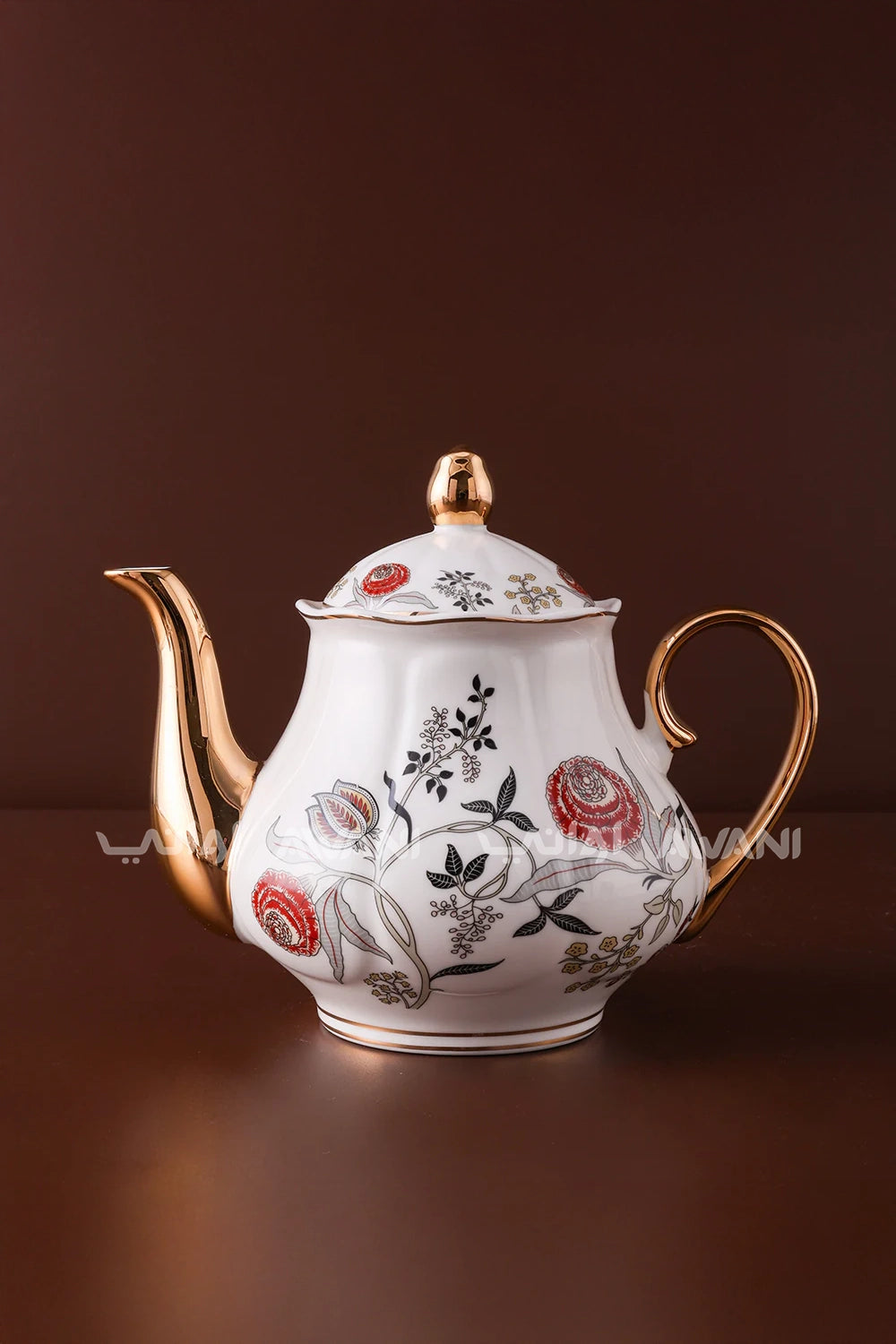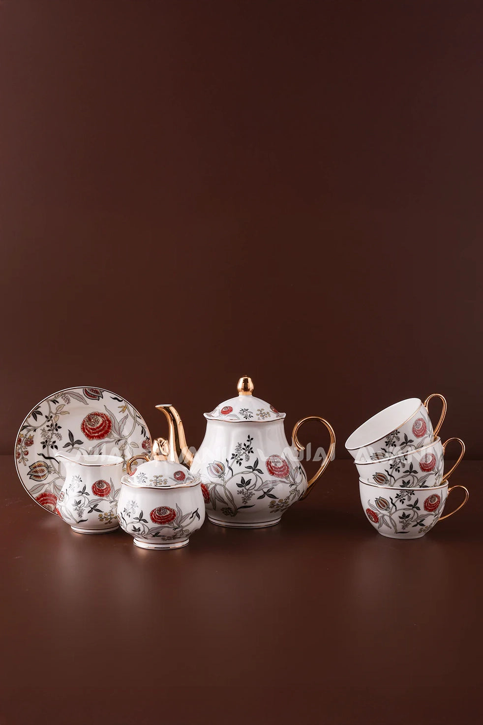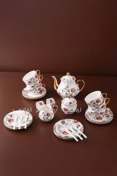 This Tea Set and Saucer Set Service includes a Teapot, Sugar Bowl, Cream Pitcher, Teaspoons, and Tea Strainer, all in a Pumpkin Fluted Shape. Serve your guests in style with this elegant and functional set. Perfect for tea parties or everyday use, this set is a must-have for any tea lover.