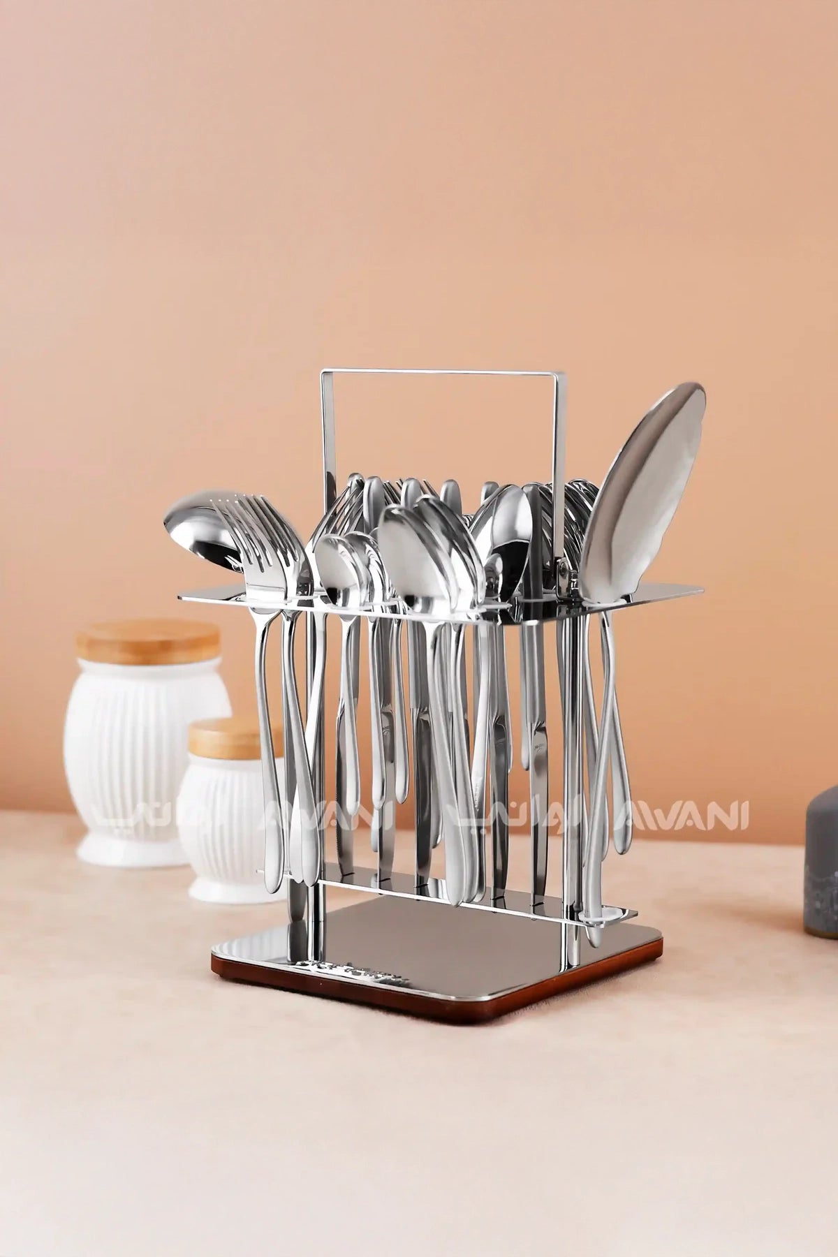 Sparkling Silver Cutlery Set with Charming Wooden Stand - 48 Pcs