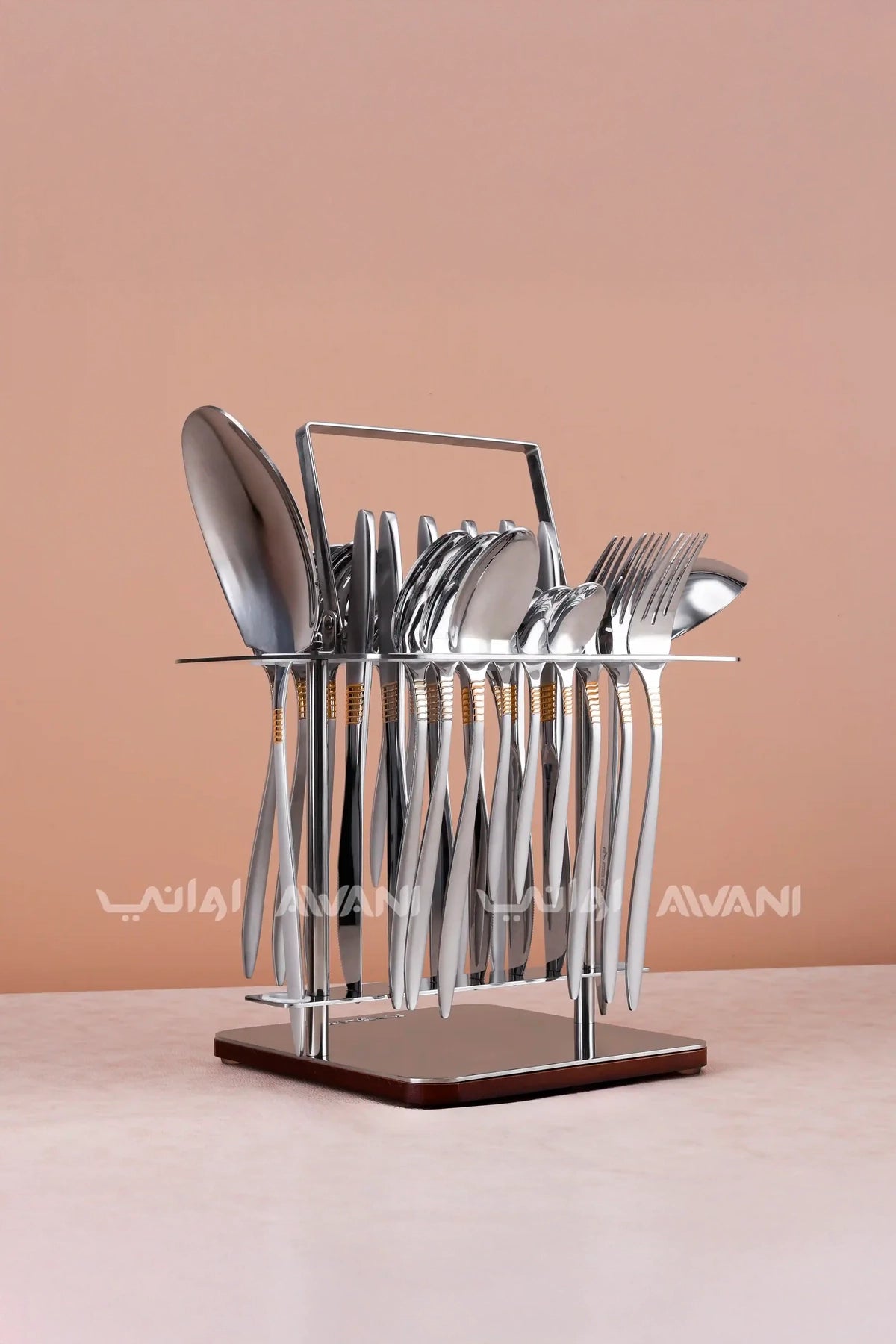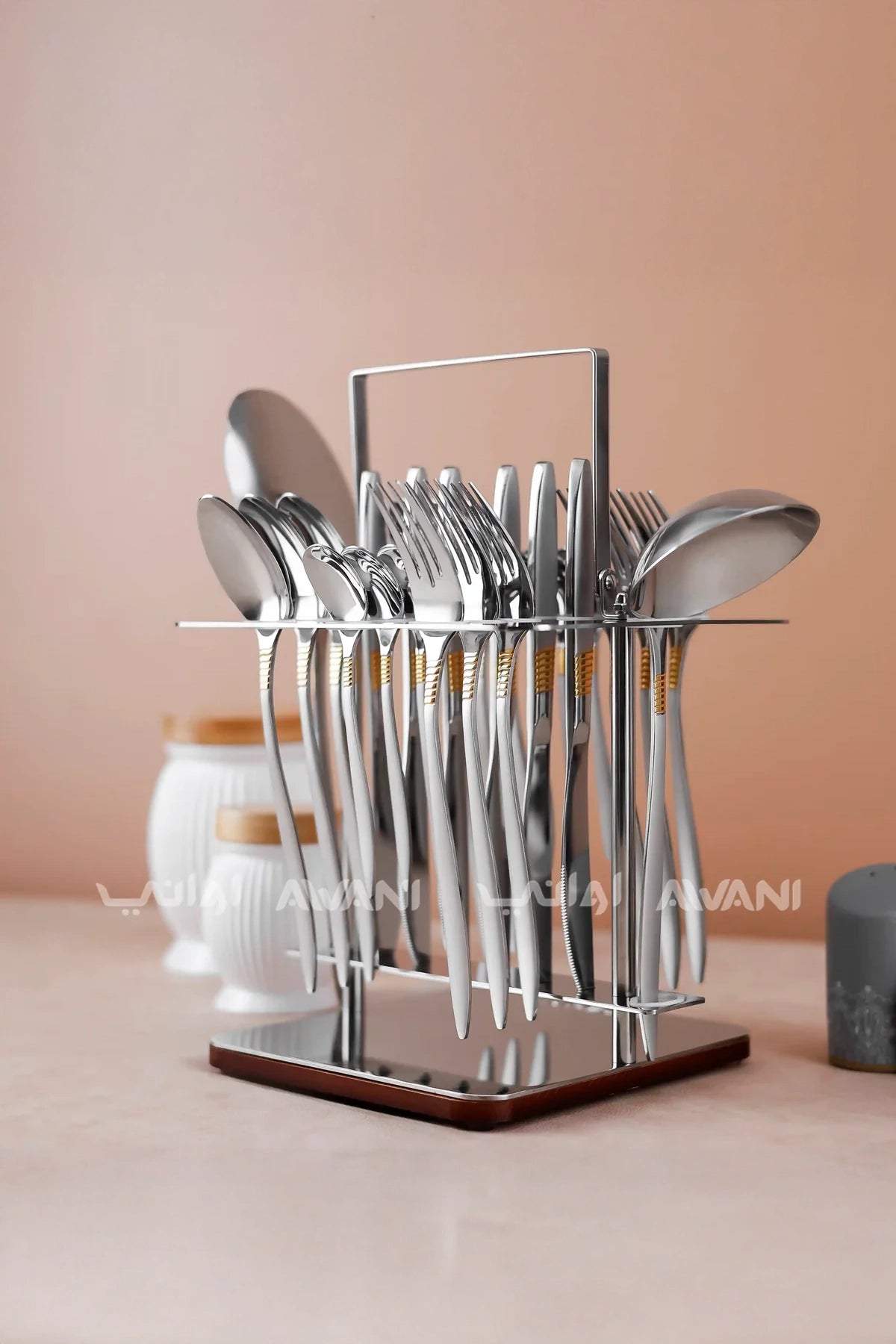 24-Piece Stainless Steel Cutlery Set with Stand – Elegant Flatware Set with Gold Accent for Dining & Kitchen