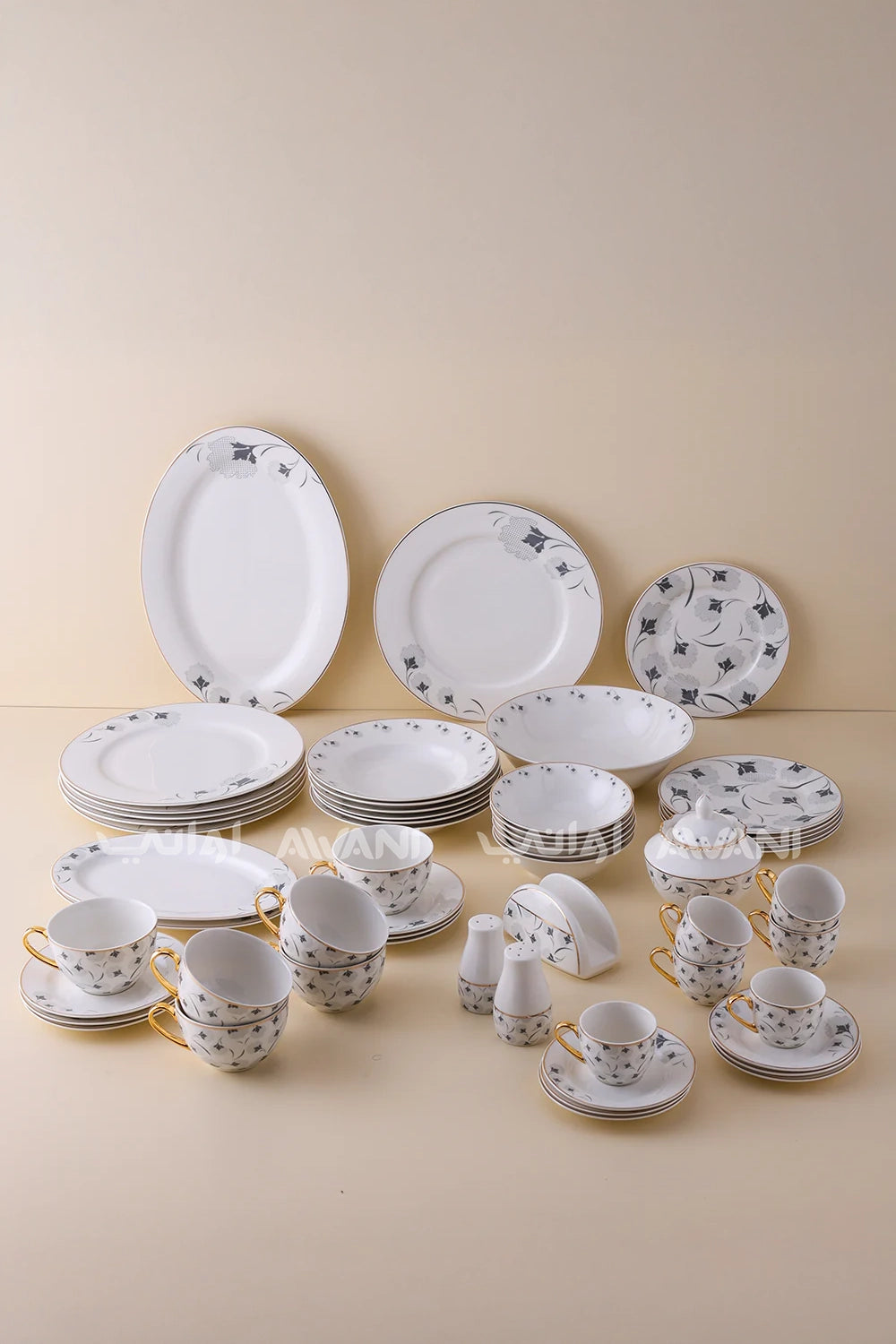 Elevate your dining experience with this comprehensive 57-piece dinnerware set, featuring an elegant blue leaf design that brings natural sophistication to every meal. This complete service includes dinner plates, bowls, and matching mugs, providing everything needed for everyday dining or entertaining guests. The cohesive botanical pattern creates a refined aesthetic across all pieces, while the generous quantity ensures you're prepared for family gatherings and special occasions. Durable and versatile, this set seamlessly transitions from casual weeknight dinners to more formal table settings, making it an essential addition to any well-appointed kitchen.