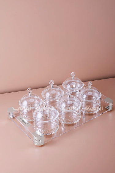 Description: This practical and elegant 6-piece serving set is perfect for any occasion. It features four clear, lidded containers, each with a decorative silver base, securely placed on a matching clear acrylic tray. Designed for convenience and visual appeal, it’s an excellent choice for serving snacks, candies, condiments, or small appetizers to your guests.