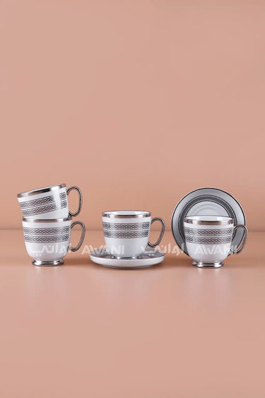 6- Piece Porcelain Coffee Cup and Saucer Set – Silver Woven Pattern