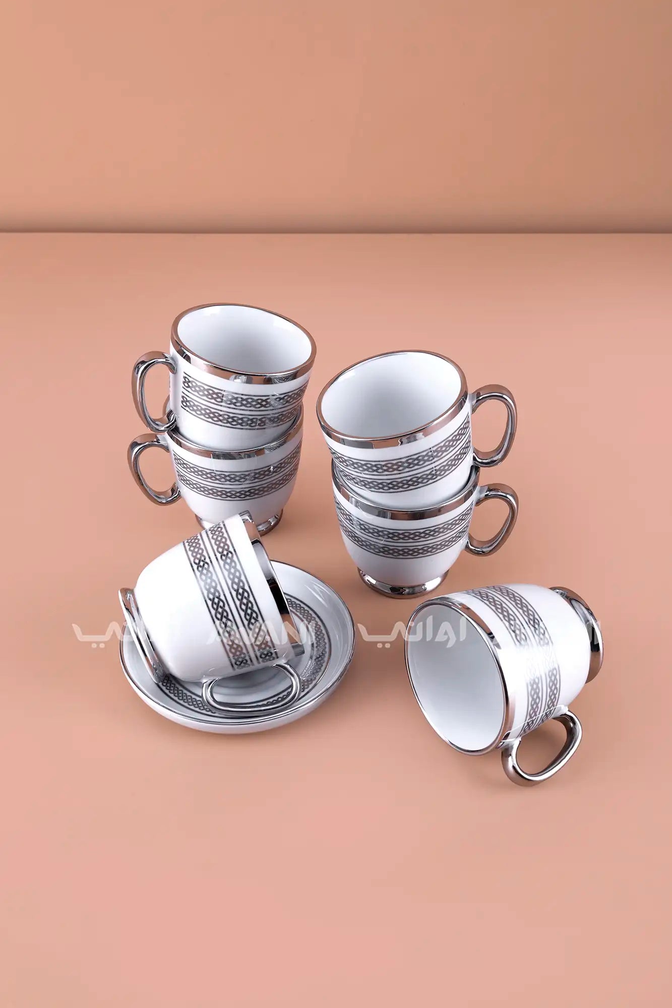 • Modern Geometric Design: Silver braided pattern on cups & saucers.