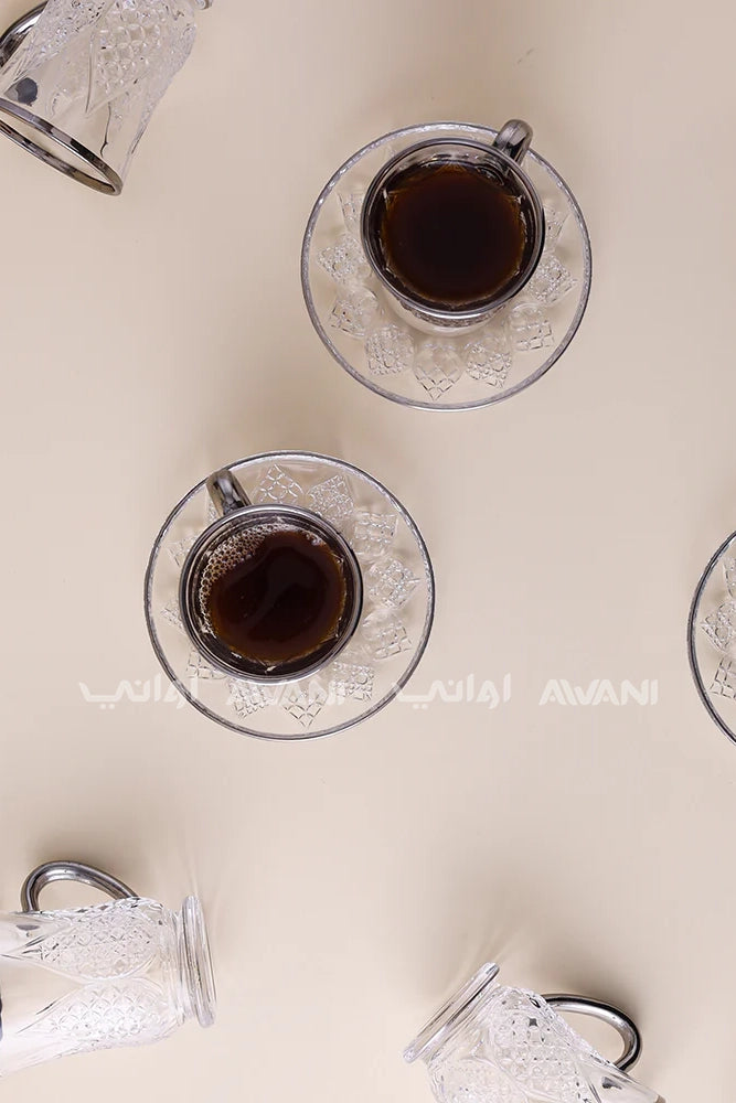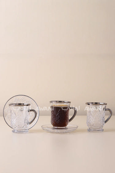 Tea Glass & Saucer Set - Leaf Design - Sets Clear - Matt Silver Color