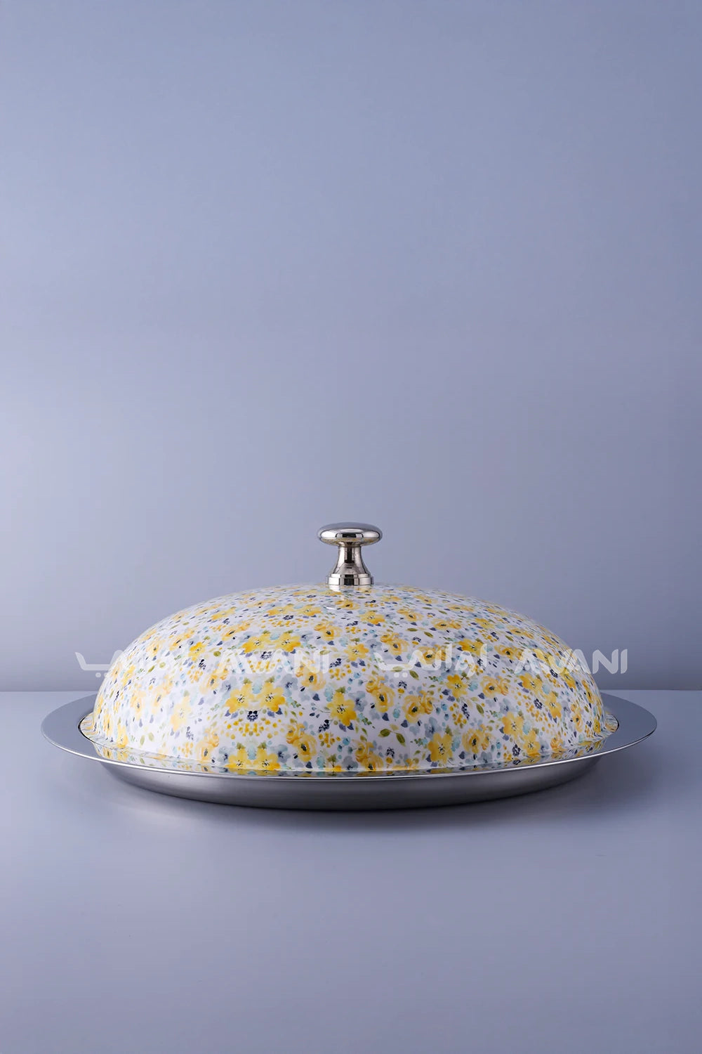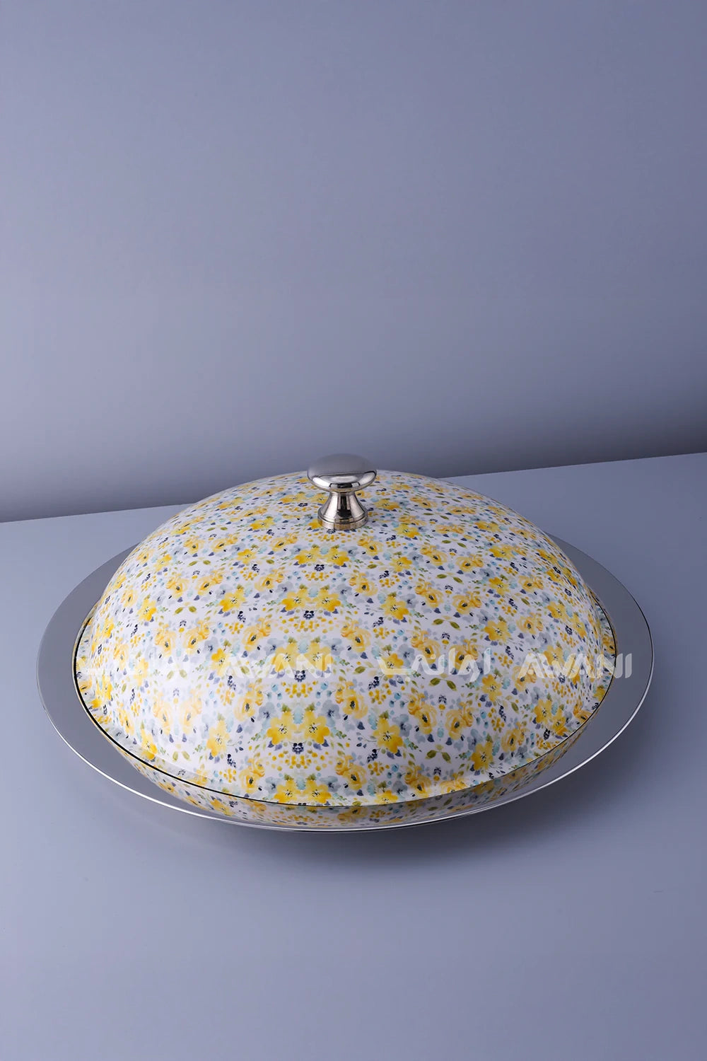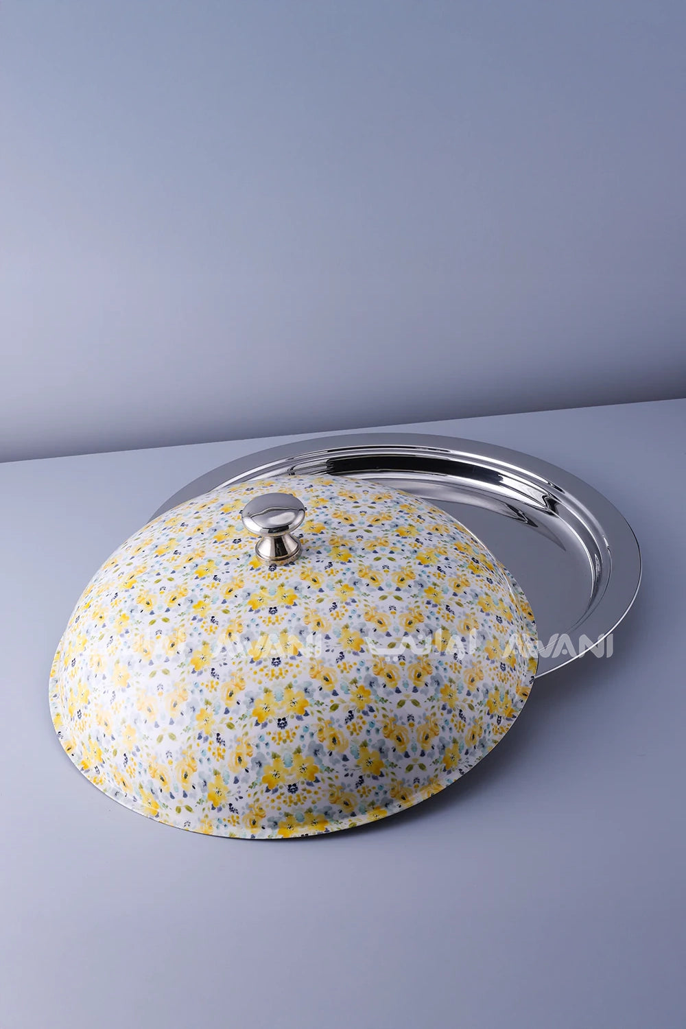 Round Full Silver Metal Tray with Cover (Yellow Flower )