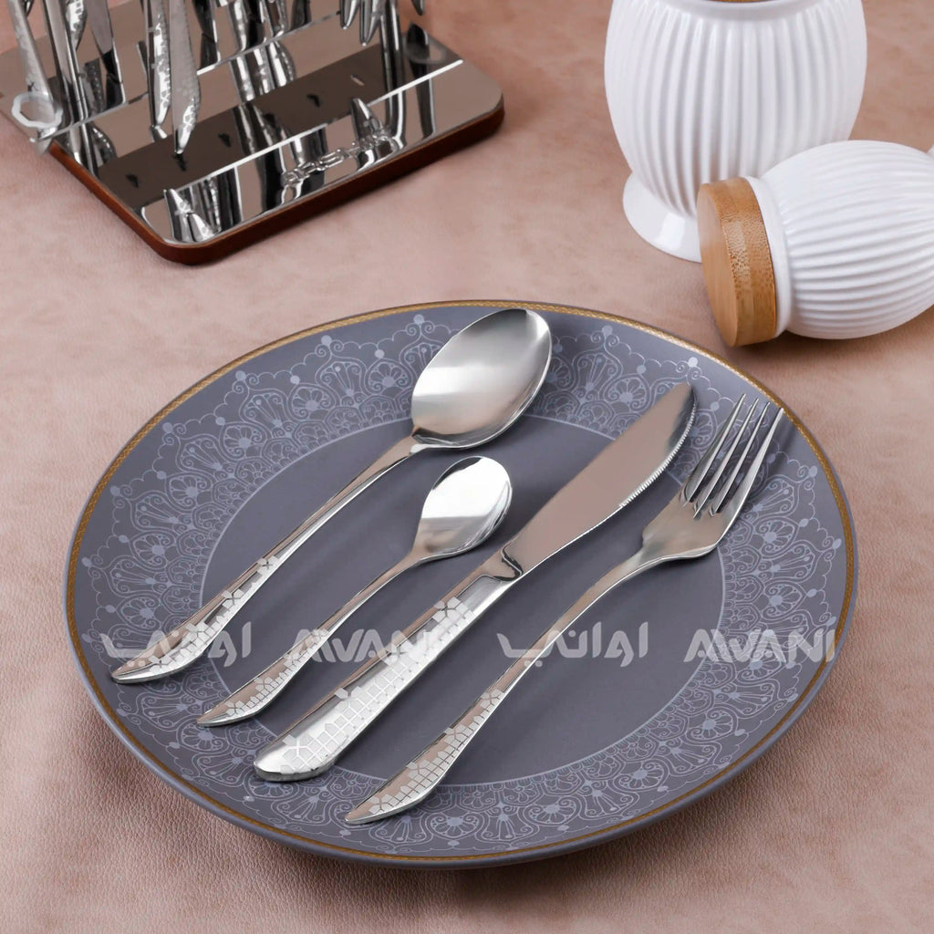 Premium 26-piece stainless steel cutlery set with mirror finish.